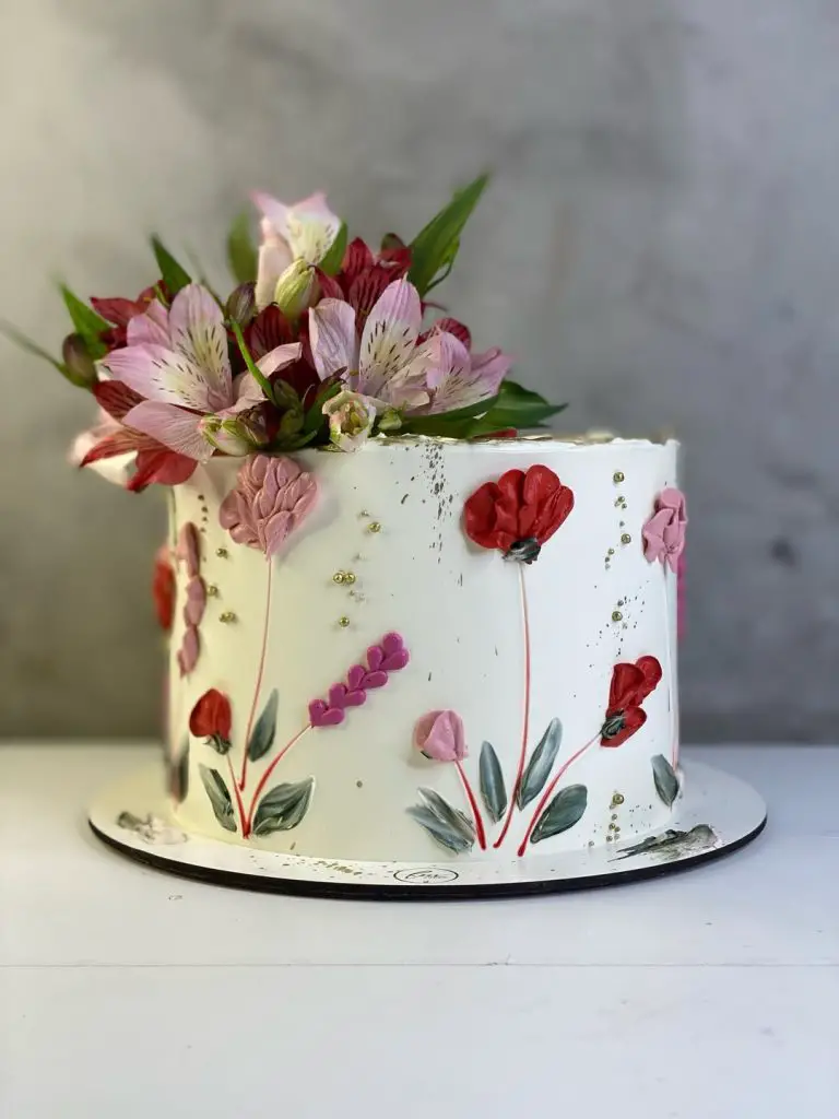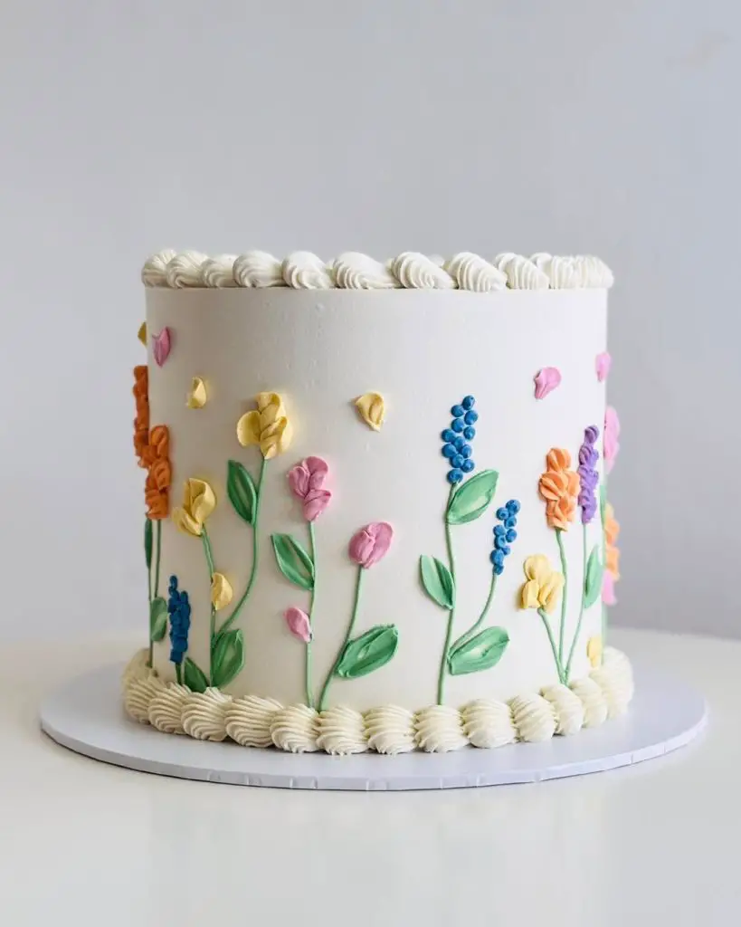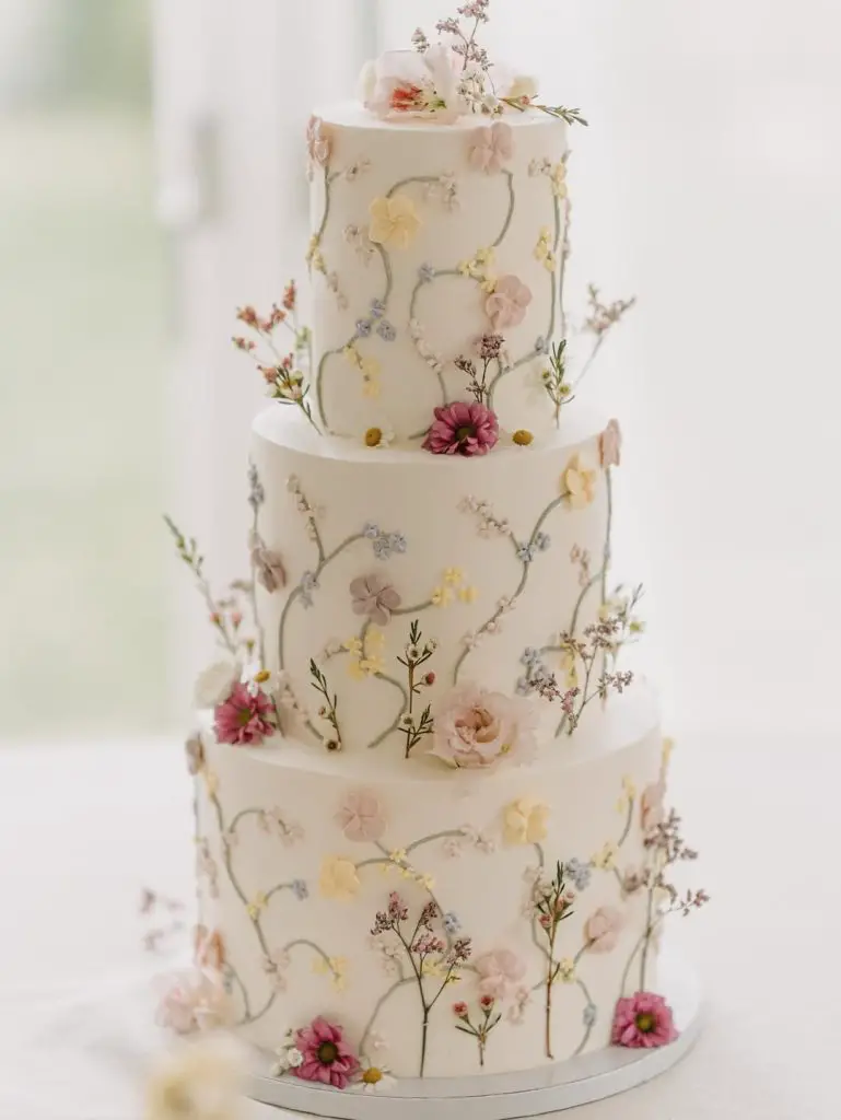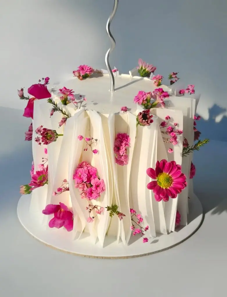 This cake reminds me of a summer field. The tall tiers were combined with delicate, thin-stemmed flowers to make the whole structure look graceful. I think the height makes it feel very professional, and your guests will love how airy and natural it looks at an outdoor party.