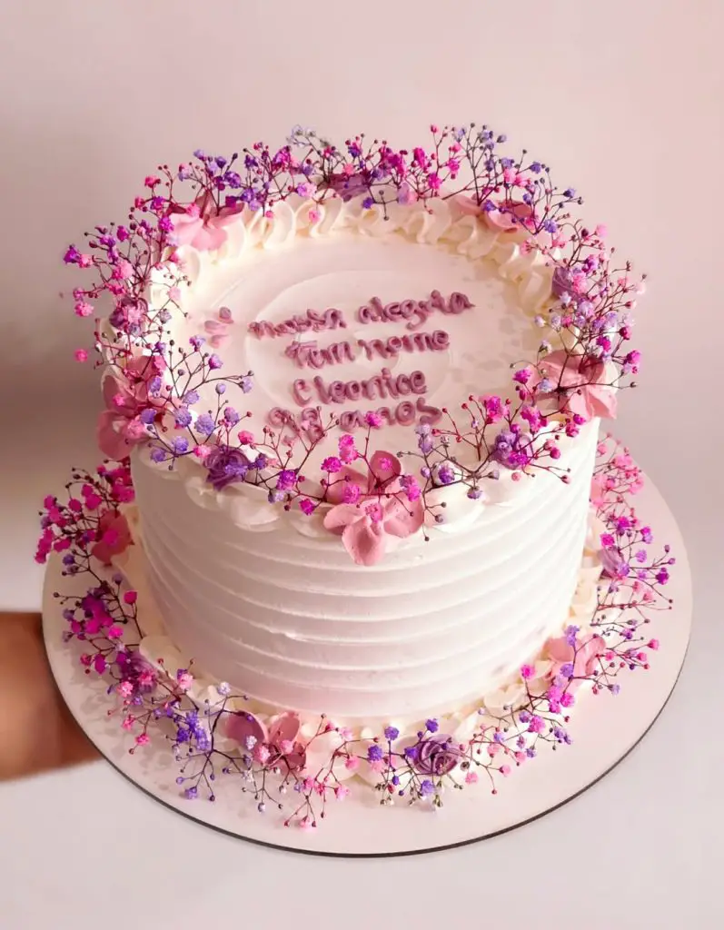 I love how a delicate wreath of baby’s breath circles the top of this cake. It’s a simple way to add romance, and the ribbed frosting was used to give it extra texture. This is a brilliant and accessible choice for any romantic party you are currently planning.