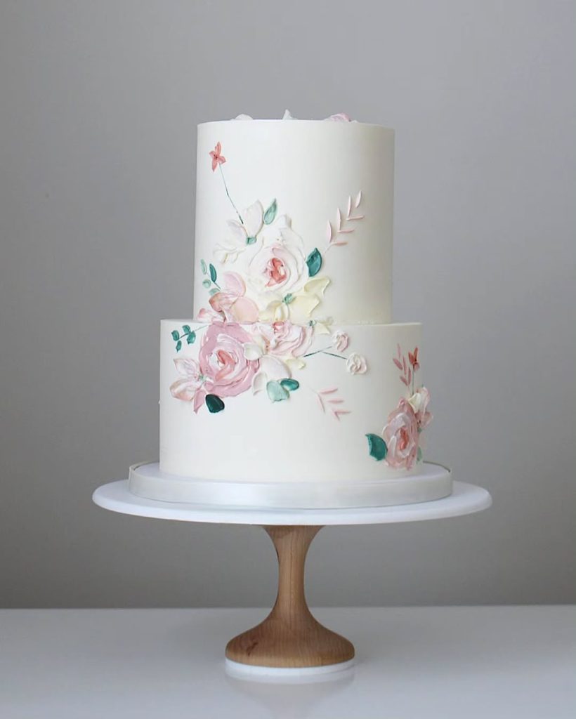 This design is incredibly posh and looks like a watercolor canvas. I love the minimalist white base because it makes those hand-painted flowers jump out at you. It’s a formal choice for a wedding, and your guests will be impressed by the artistic flair that was applied to the frosting.