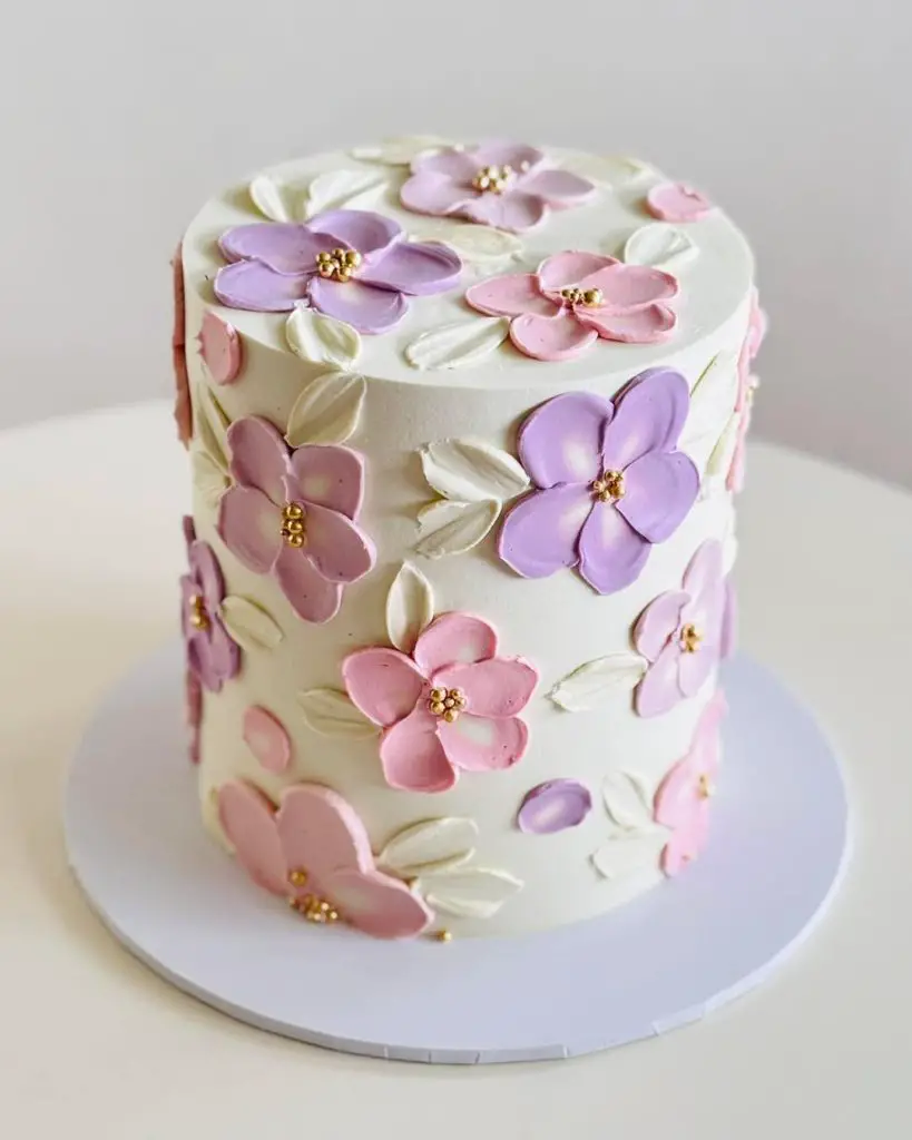 I absolutely love the punchy colors on this single-tier design. Purple and pink shades were used to pop against the white frosting, making it a stellar centerpiece. It’s fun, it’s bright, and it’s exactly what I want when I’m aiming for a very “aesthetic” look for a small dinner.