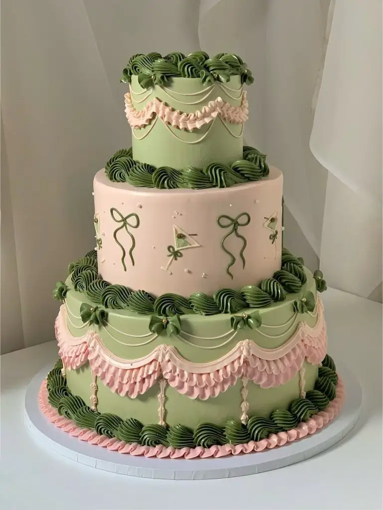 This vintage Lambeth style is making a huge comeback. I love the sage green frosting and how it was paired with pink piping and bows. It feels nostalgic, and you’ll find that this royal look is perfect for anyone who wants a classic, ornate vibe for their big day.