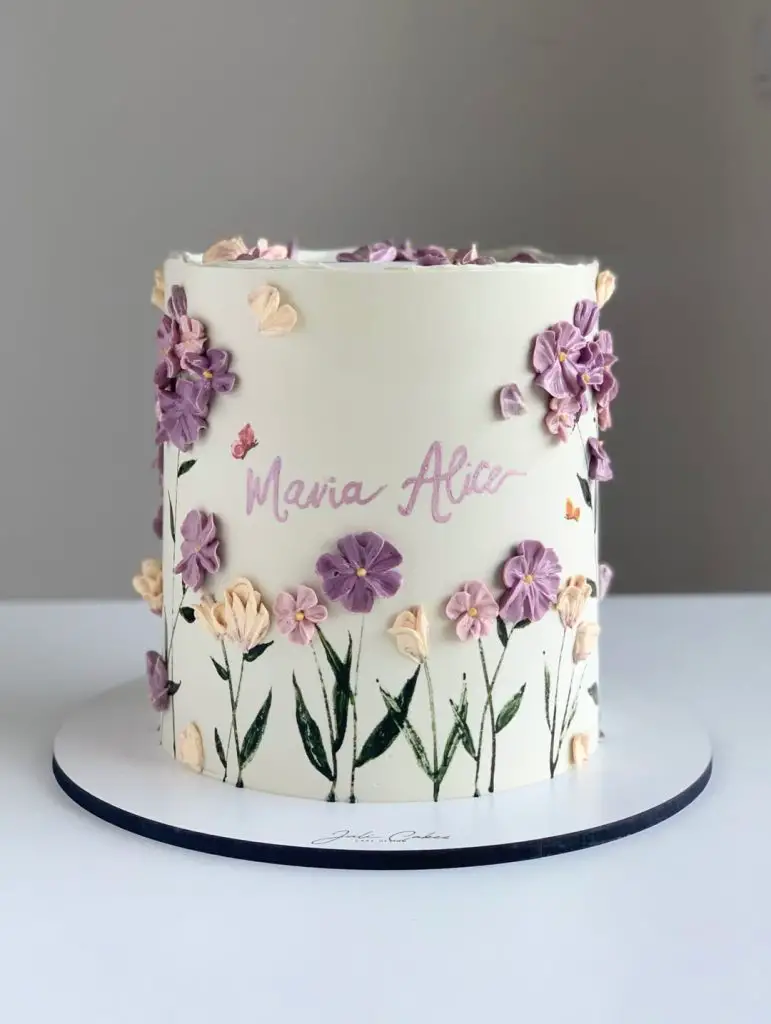I’m in love with how personal this feels with the scripted name right in the middle. Purple flowers were piped to climb up the sides like a spring garden. It’s a beautiful way to celebrate someone, and you’ll find that the calligraphy adds a very custom, high-fashion feel.