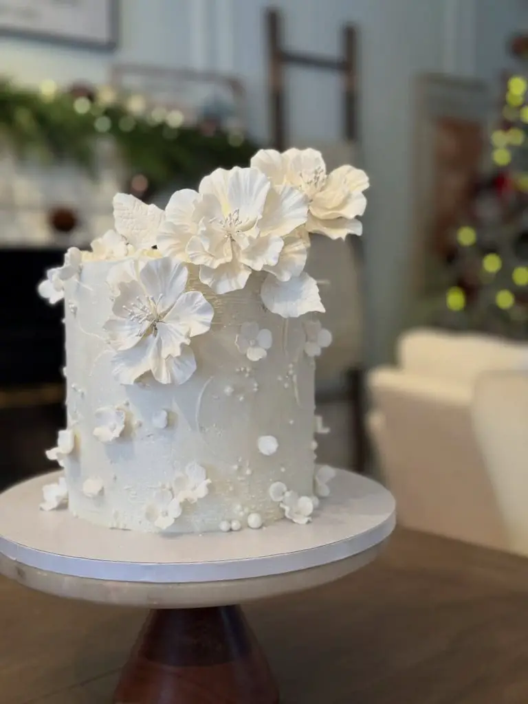 These aren’t your average frosting flowers. They’re made of wafer paper, which is why they look so crisp and structural. I love the way they “explode” off the side of the cake. It’s an artistic choice for someone who wants to stand out.