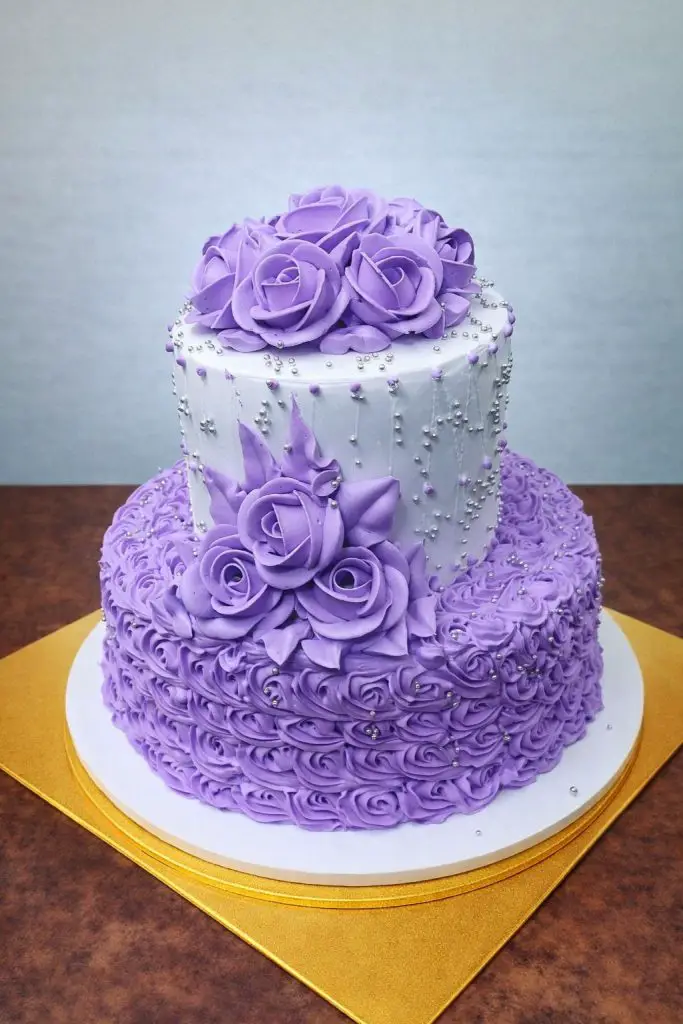 The bottom tier is a sea of purple rosettes that slowly fade as you move up. I love the little silver balls scattered on the top tier—they look like tiny bubbles or morning dew. It’s a great way to use a favorite color without it being “too much.”