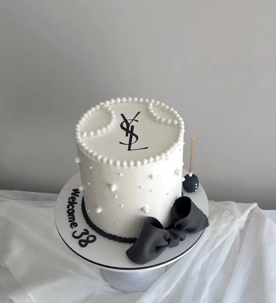 For the fashionistas! The YSL logo is the center of attention here. With the pearl “studs” and the black silk-style ribbon, it looks like it belongs in a boutique window. It’s definitely a “Welcome 38” birthday to remember.