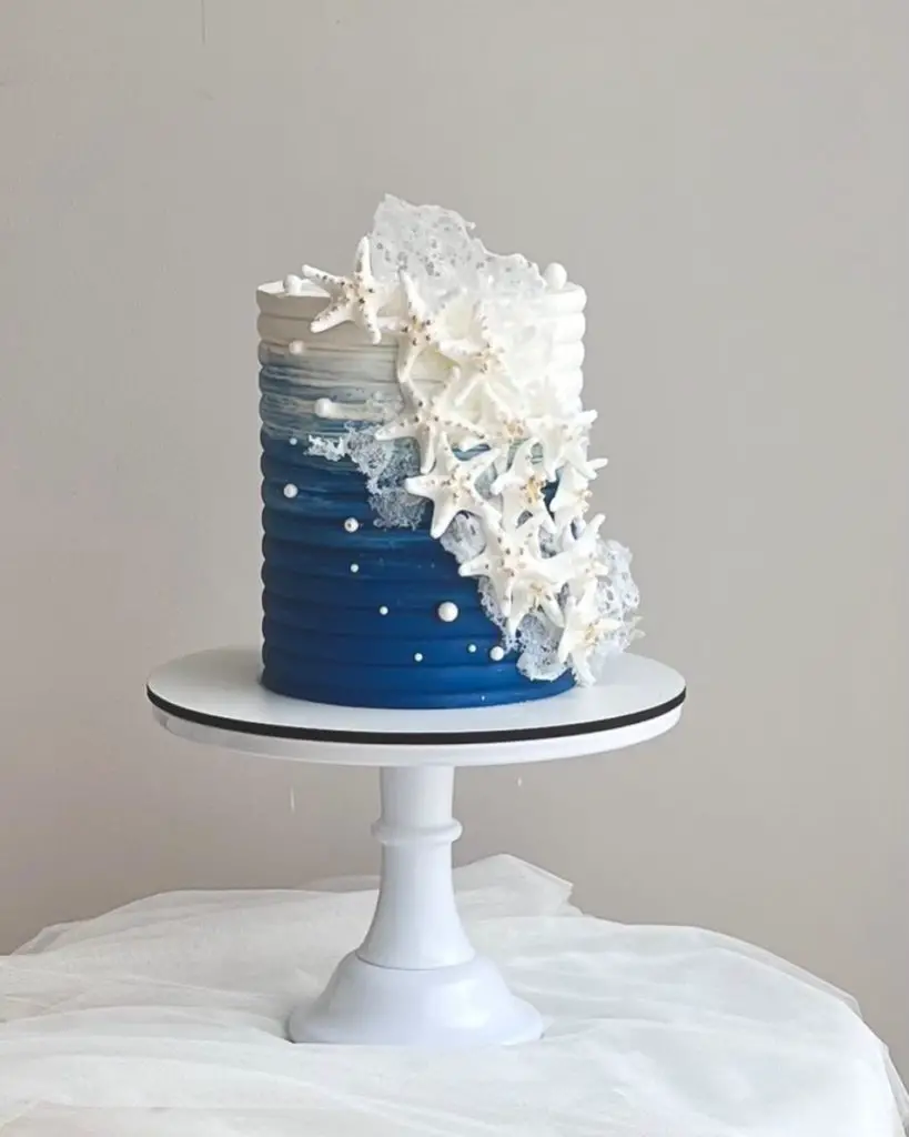 The dark navy blue at the bottom is so moody and cool. Then, you have this white “lace” sugar that looks like it’s melting or growing over the side. It’s a very dramatic design that works well for evening events.
