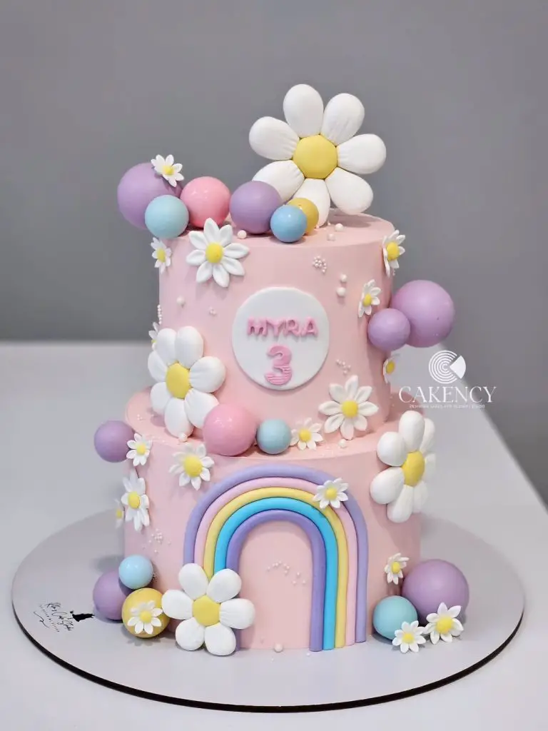This cake is basically a happy dream. The rainbow is made of soft fondant, and the “clouds” are actually giant daisies. It’s a very popular style for toddlers’ birthdays because it’s so friendly and bright.