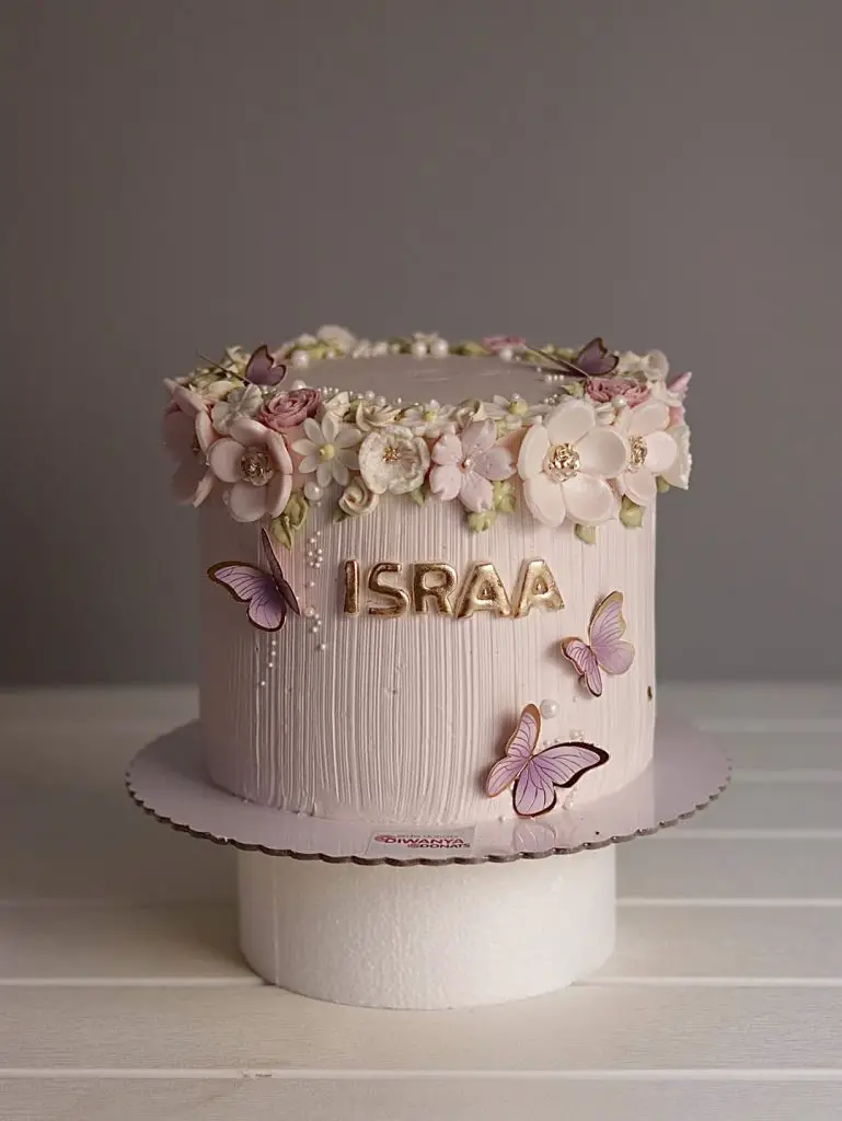 I love the lavender color here—it’s very calming. The name “ISRAA” is done in gold, and it’s surrounded by real dried flowers. It’s a bit “boho,” a bit “indie,” and 100% beautiful.