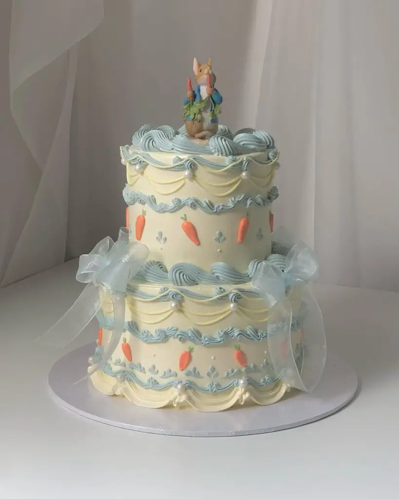This is just adorable. The little carrots are piped onto the sides, and the light blue ribbons are actually made of fabric-style fondant. It’s a classic theme that never feels dated because it’s so well-executed.