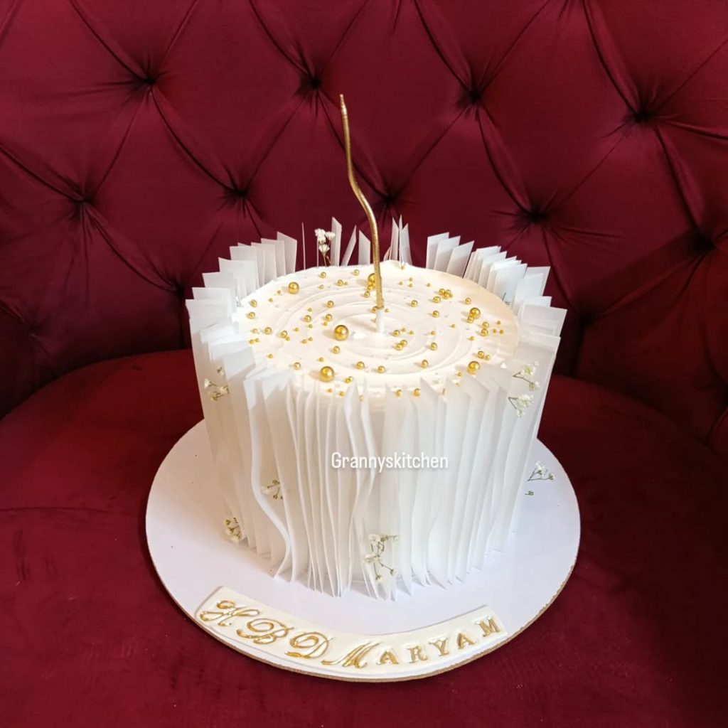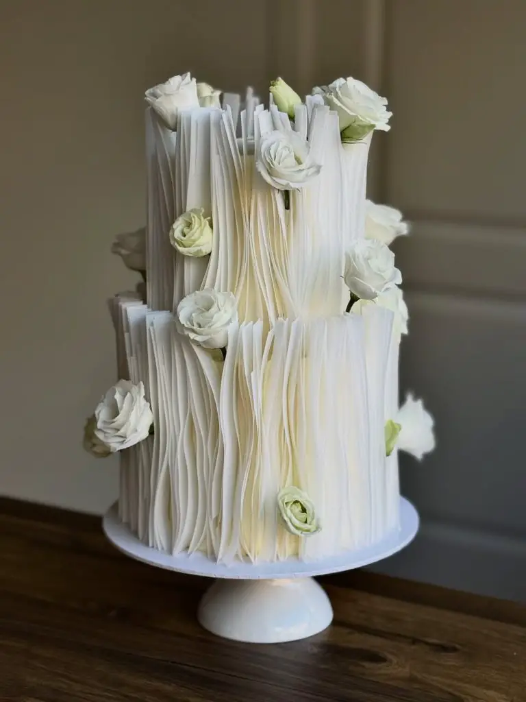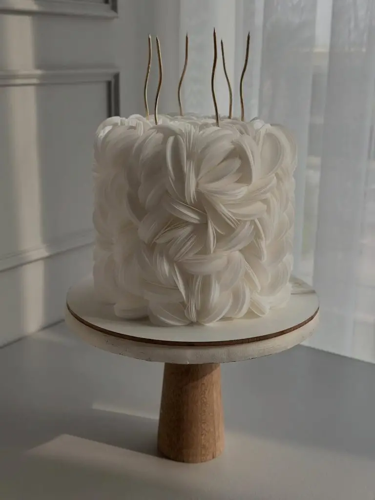 This one looks like it belongs in an art gallery. The “pleats” are made of thin strips of white chocolate or fondant, and the gold splatter gives it a messy-but-cool finish. It’s the perfect mix of structured and chaotic.