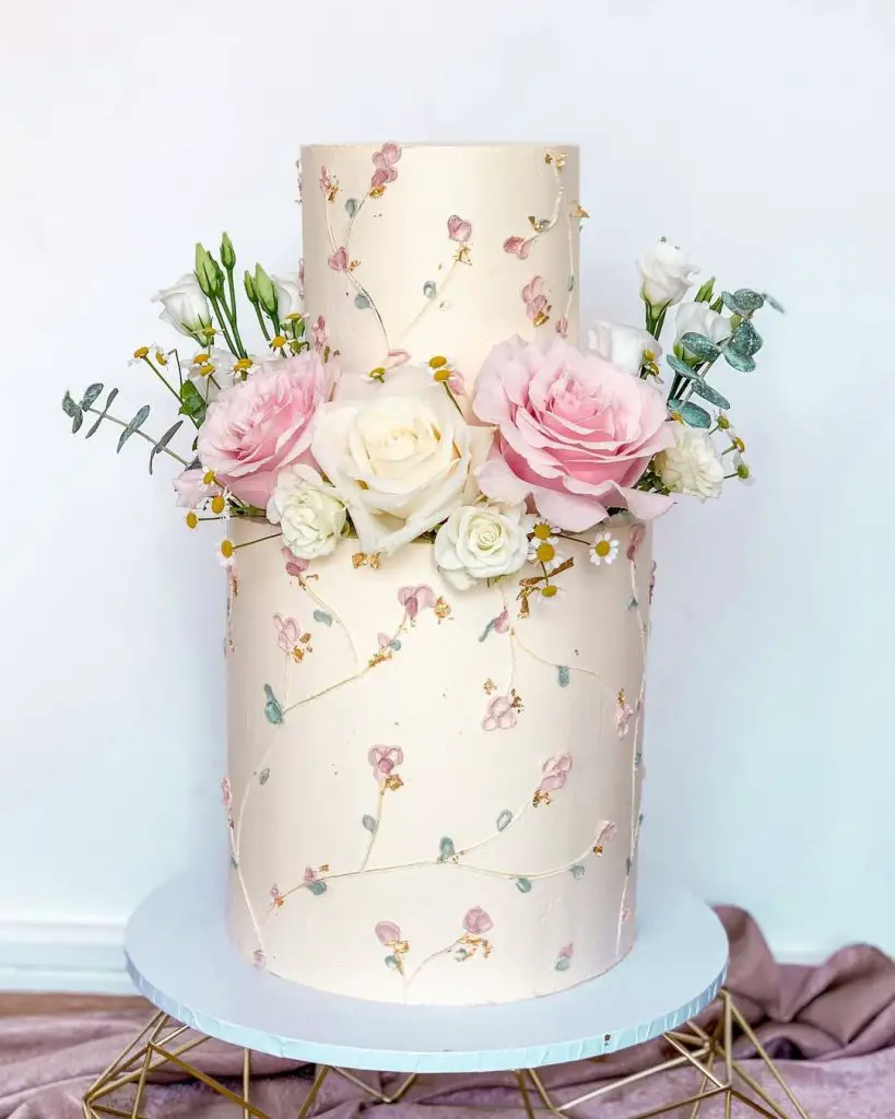 This two-tier beauty feels like a secret garden was painted onto the fondant. While the tiny vines are hand-applied, the larger roses are placed strategically to create a sense of height. It’s the kind of thing you’d see at a fancy afternoon tea, honestly.