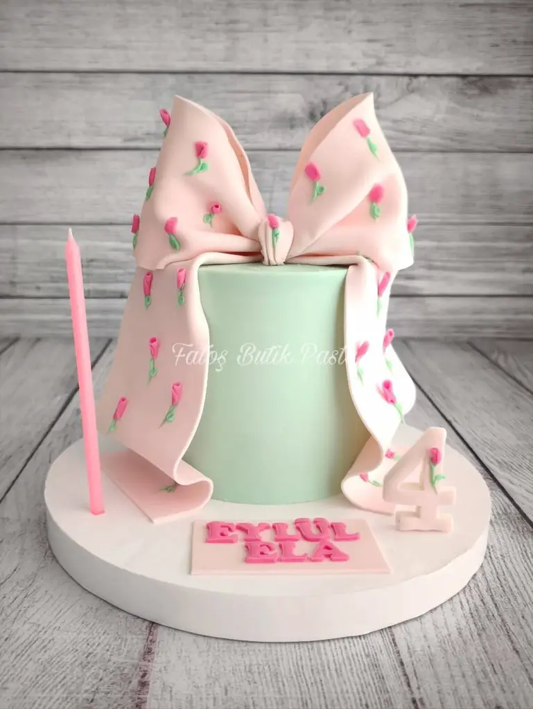 Look at that massive bow! It’s actually made of edible sugar paste, and the tulip print is so charmingly “old school” but in a modern way. The sage green base color provides a cool backdrop that lets the pink really pop.