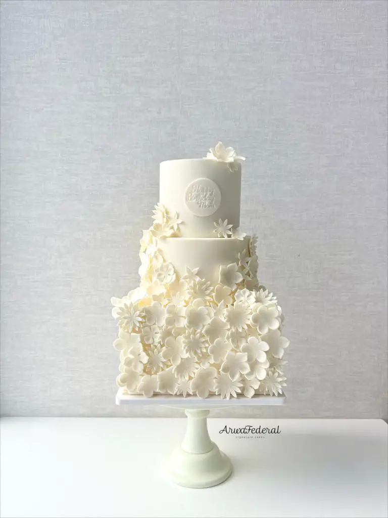 Thousands of tiny sugar flowers are glued to this cake. It must have taken hours! The result is a texture that looks like a fluffy white gown. You should definitely pick this if you want something that looks expensive and high-fashion.