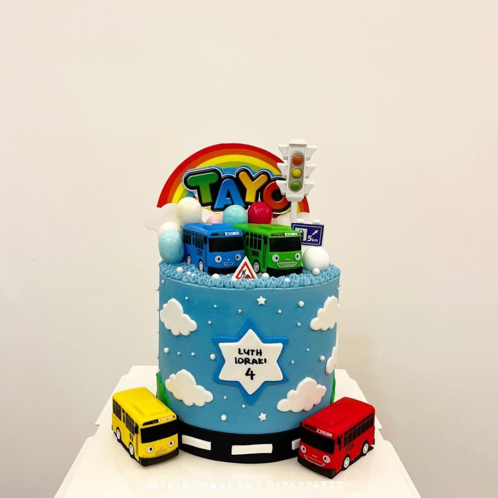 Tiny buses circle the cake, and it feels joyful. The colors stay playful without overwhelming.