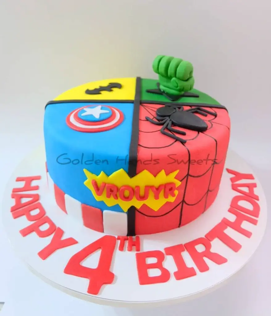 Multiple heroes share one cake, yet it feels clean. The shield layout keeps everything balanced. A Birthday Cake for 4 years boy like this always gets reactions.