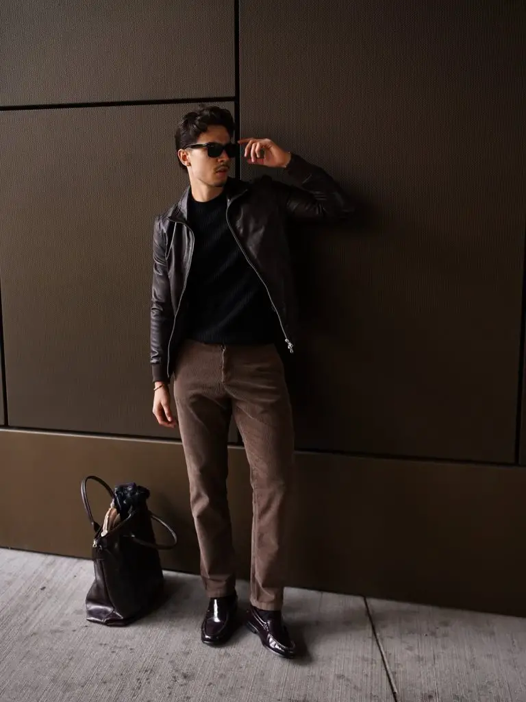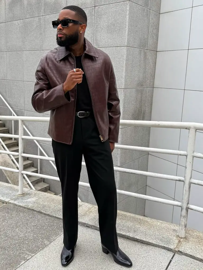 Going all black with a brown jacket is a classic for a reason. It slims you down and makes the jacket the star of the show. You look sharp and ready for drinks or a concert.