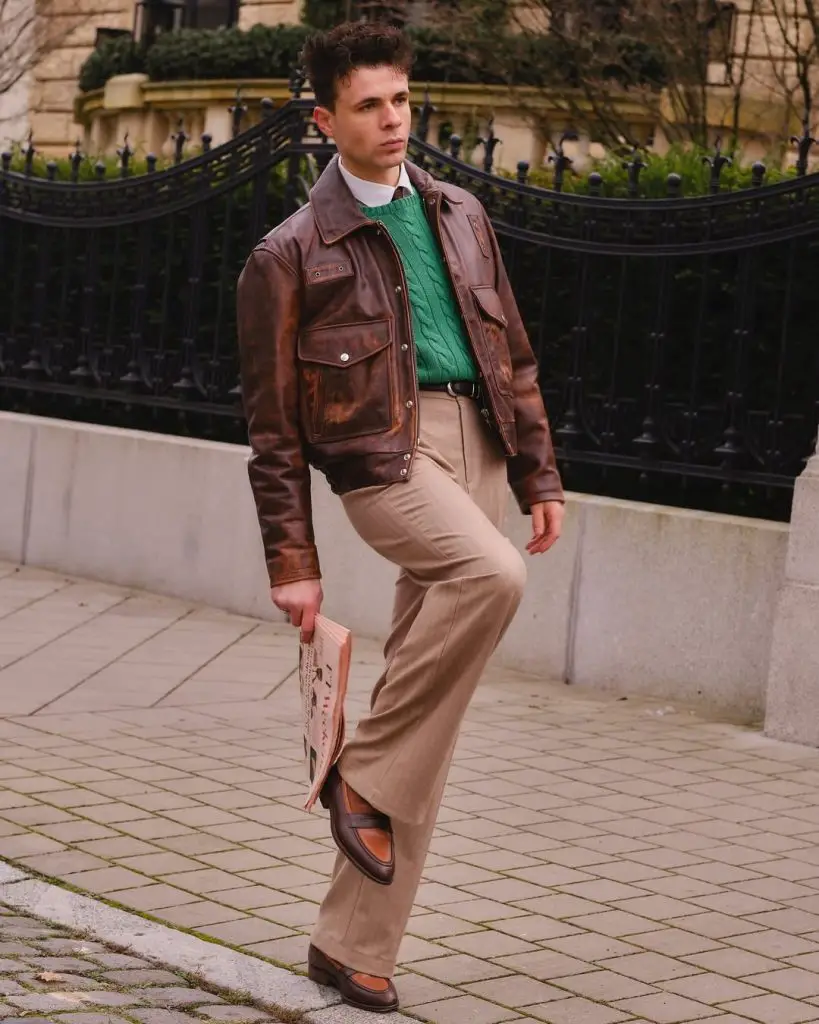I like how the beige chinos are used to brighten up the whole outfit. It takes the edge off the leather so you don’t look too aggressive. You’re left with a style that is super approachable and easy to wear.