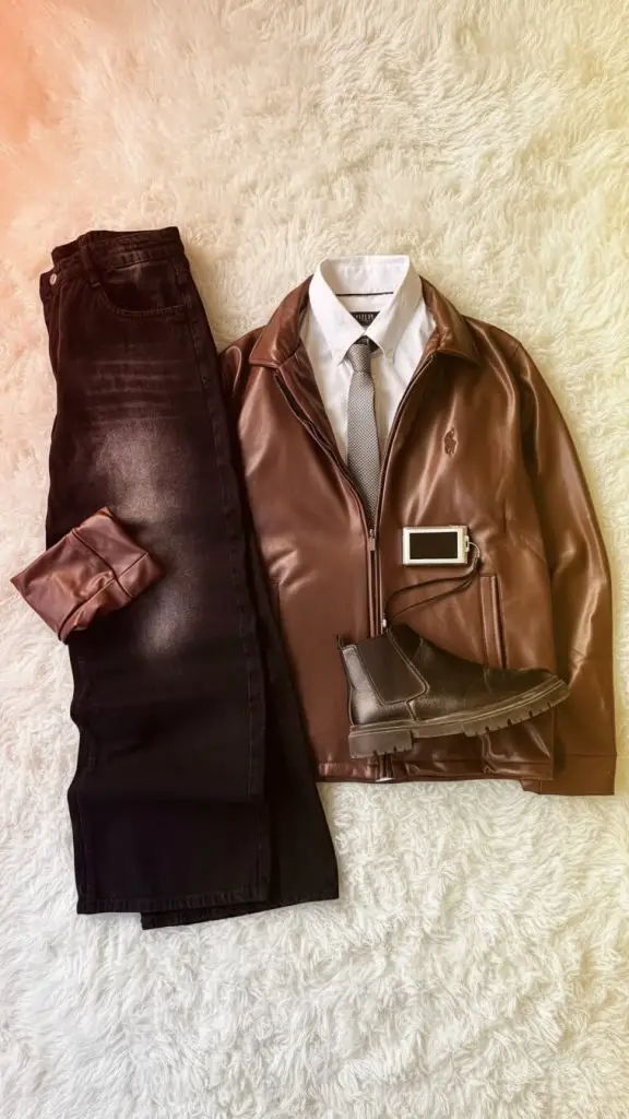 This flat lay shows that denim doesn’t always have to look sloppy. The rich brown tones are coordinated from the jacket down to the boots. It feels like a very intentional choice, not something thrown together.