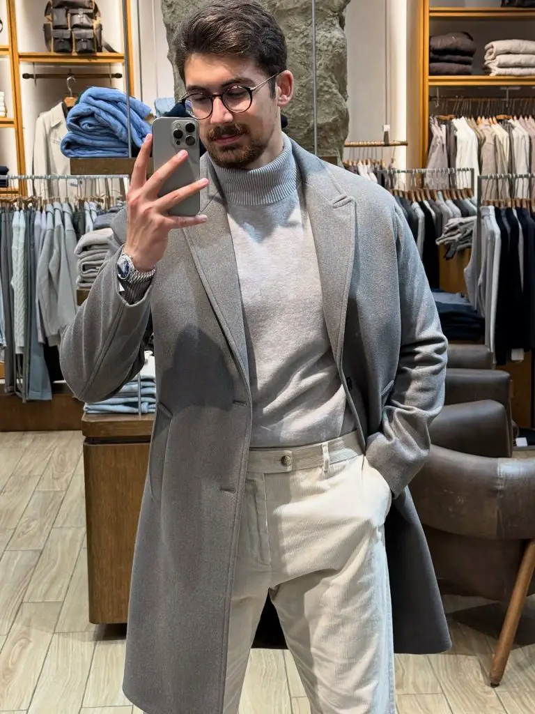 This outfit feels measured. The grey coat sharpens the silhouette, and the neutral layers fall into place naturally.