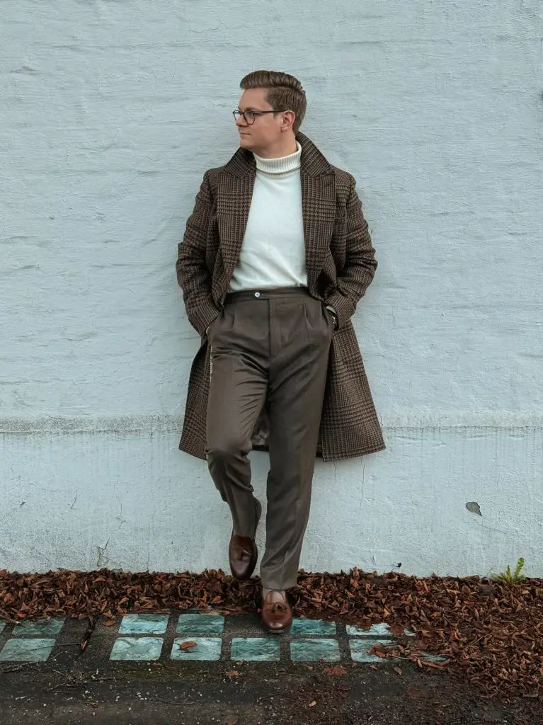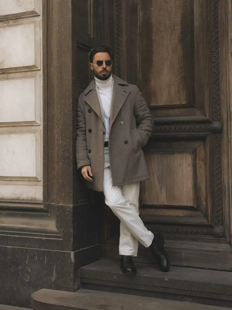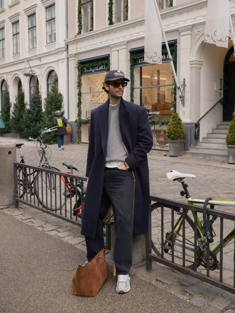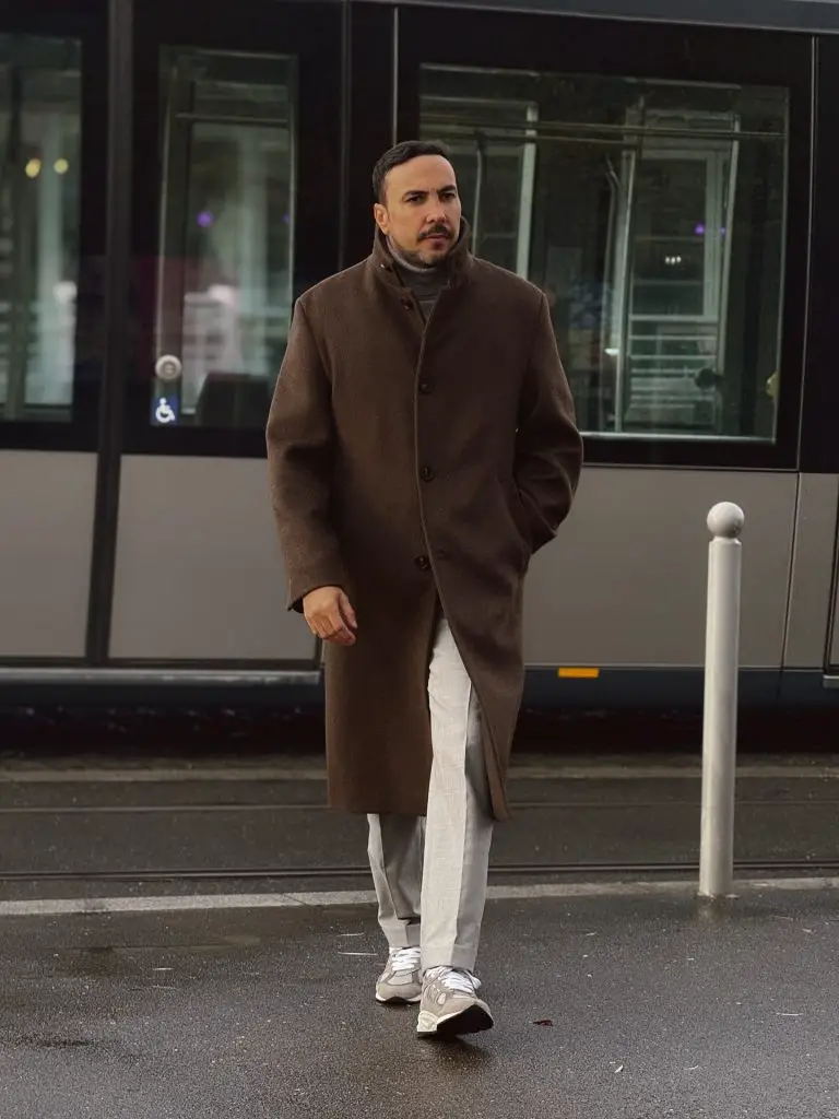This outfit bends the rules a bit. The coat feels refined, yet casual elements sneak in, and somehow it works better because of that.