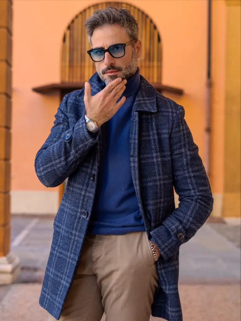 Patterns can be risky, yet this one behaves. The coat carries personality, while the layers beneath stay disciplined enough to keep balance.