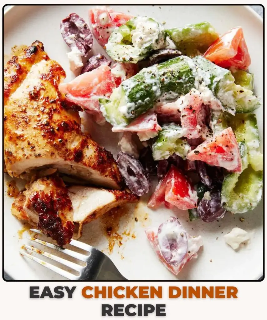 A cold salad of feta and olives is served alongside warm, yogurt-marinated chicken. This is incredibly refreshing on a hot day. The marinade makes the chicken so tender it practically melts, and the salty olives provide a great kick.