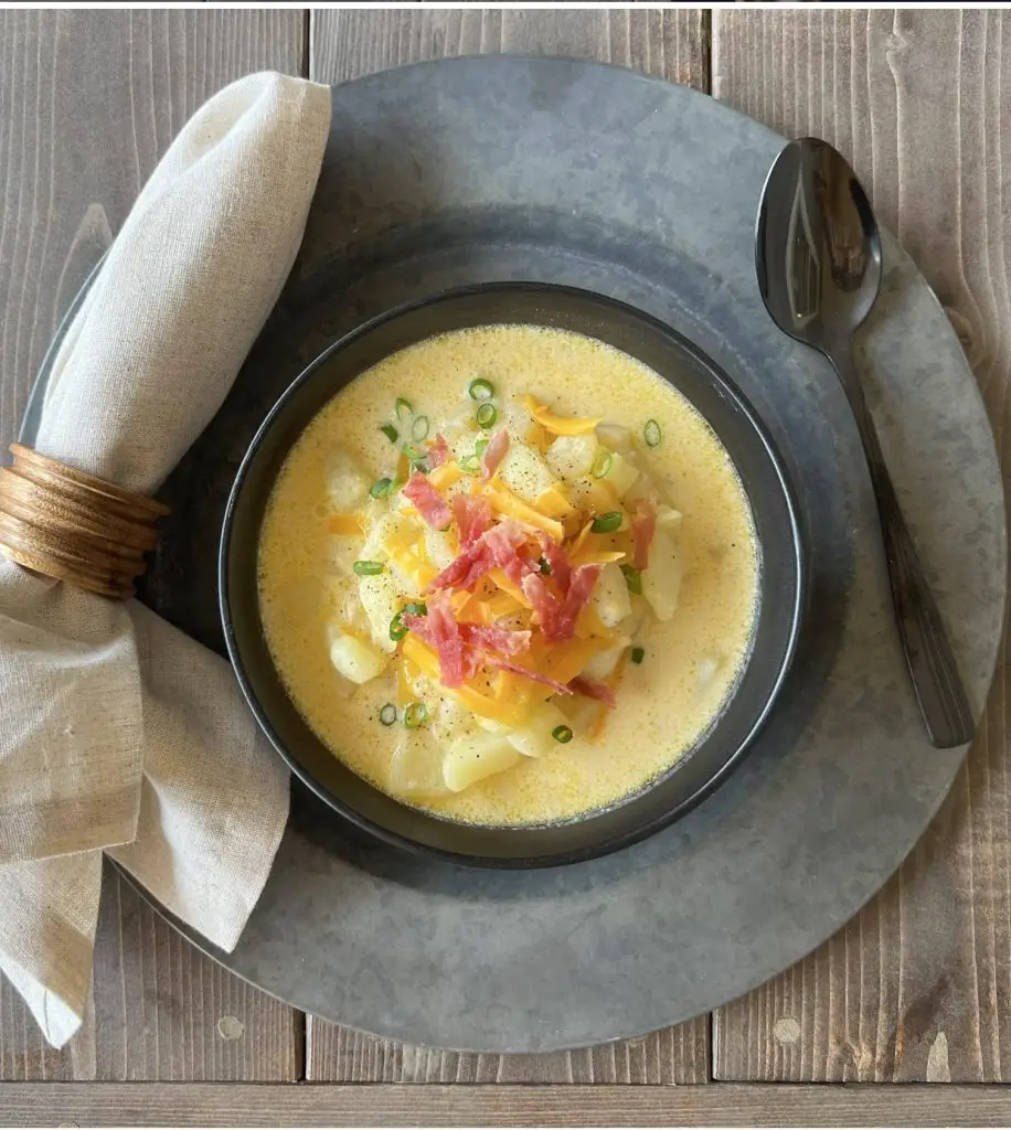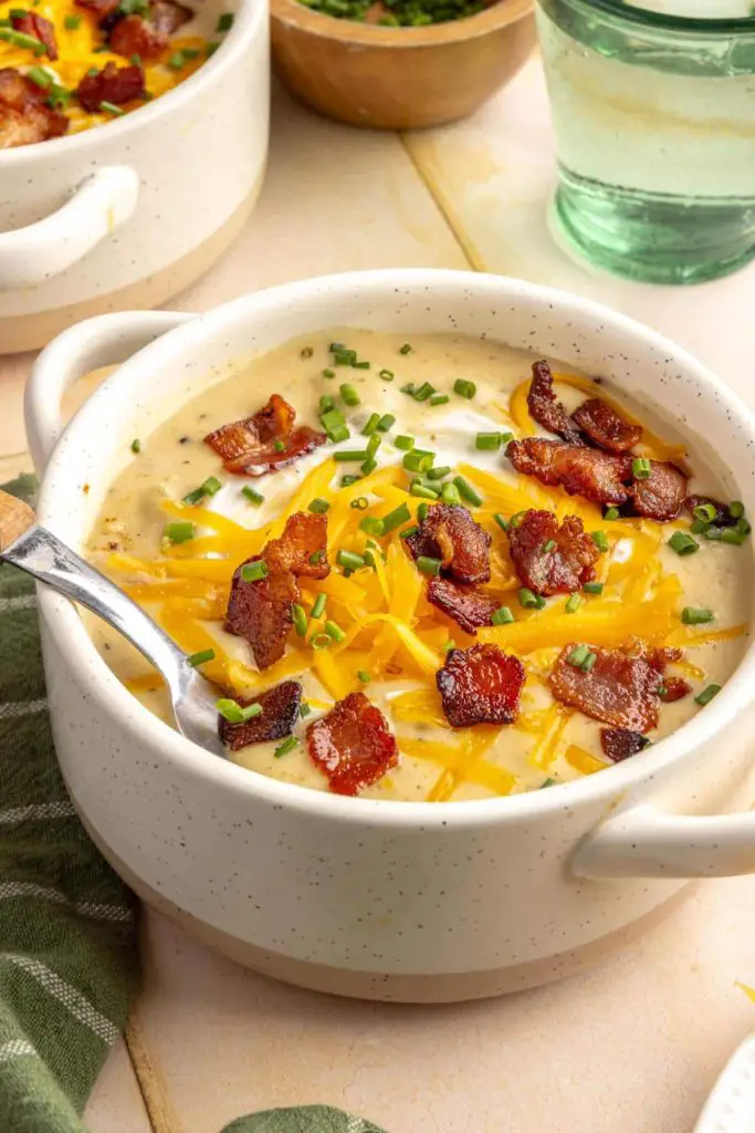 Everything you like about a baked potato, just easier to eat. It’s thick, creamy, and topped aggressively. This soup is not shy.