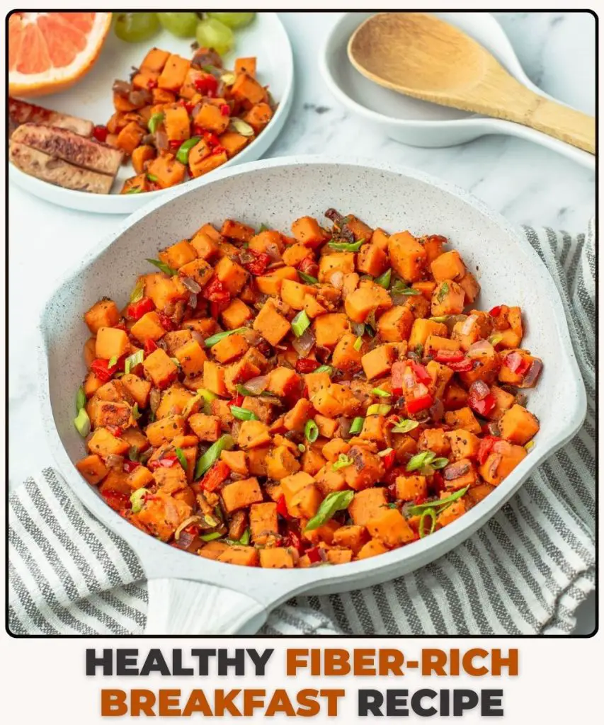 Bacon makes everything more fun. The smoky flavor of the bacon is absorbed by the sweet potatoes while they roast. This recipe is often chosen for special occasions or brunches. Its indulgent but still packed with the fiber you need.
