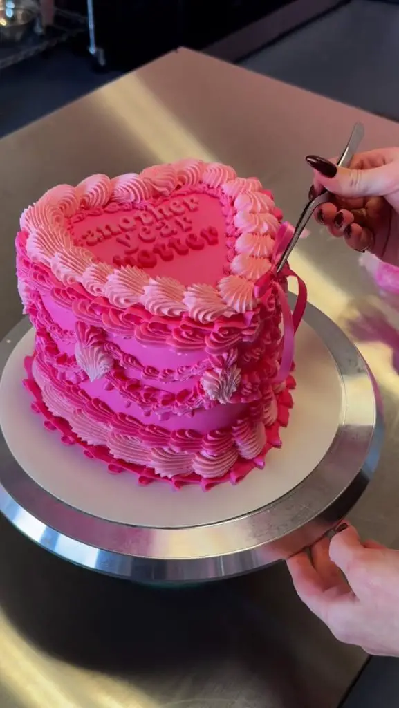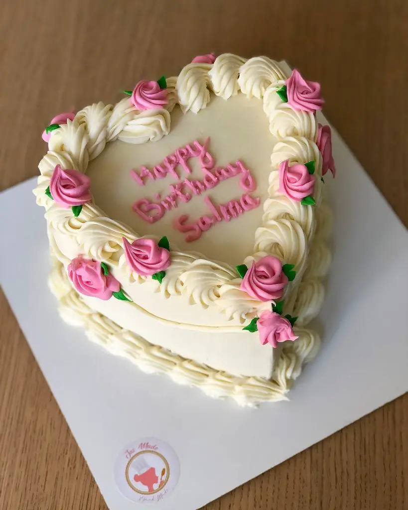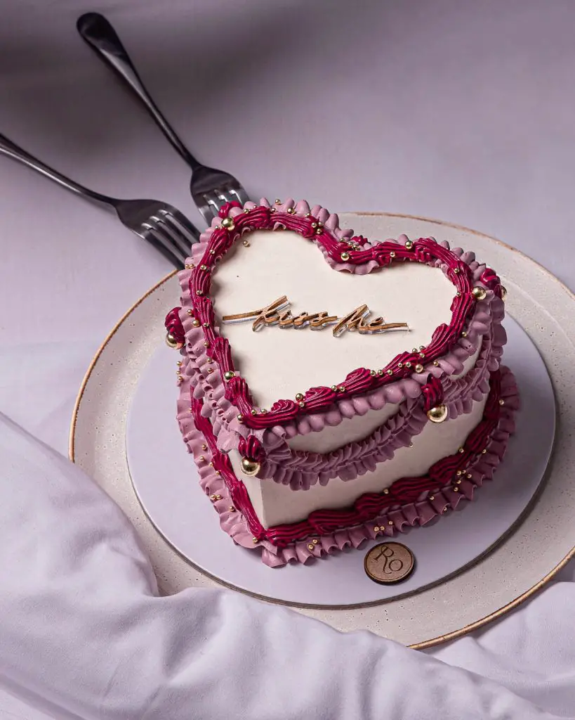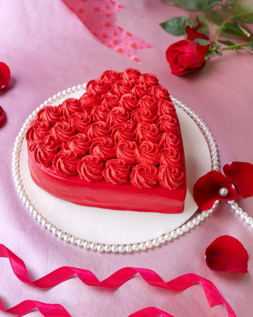 Every inch is covered here, and nothing feels accidental. The rosettes were clearly planned, yet the softness keeps it friendly. It’s bold, but not shouting, which isn’t easy to pull off in a heart cake design.