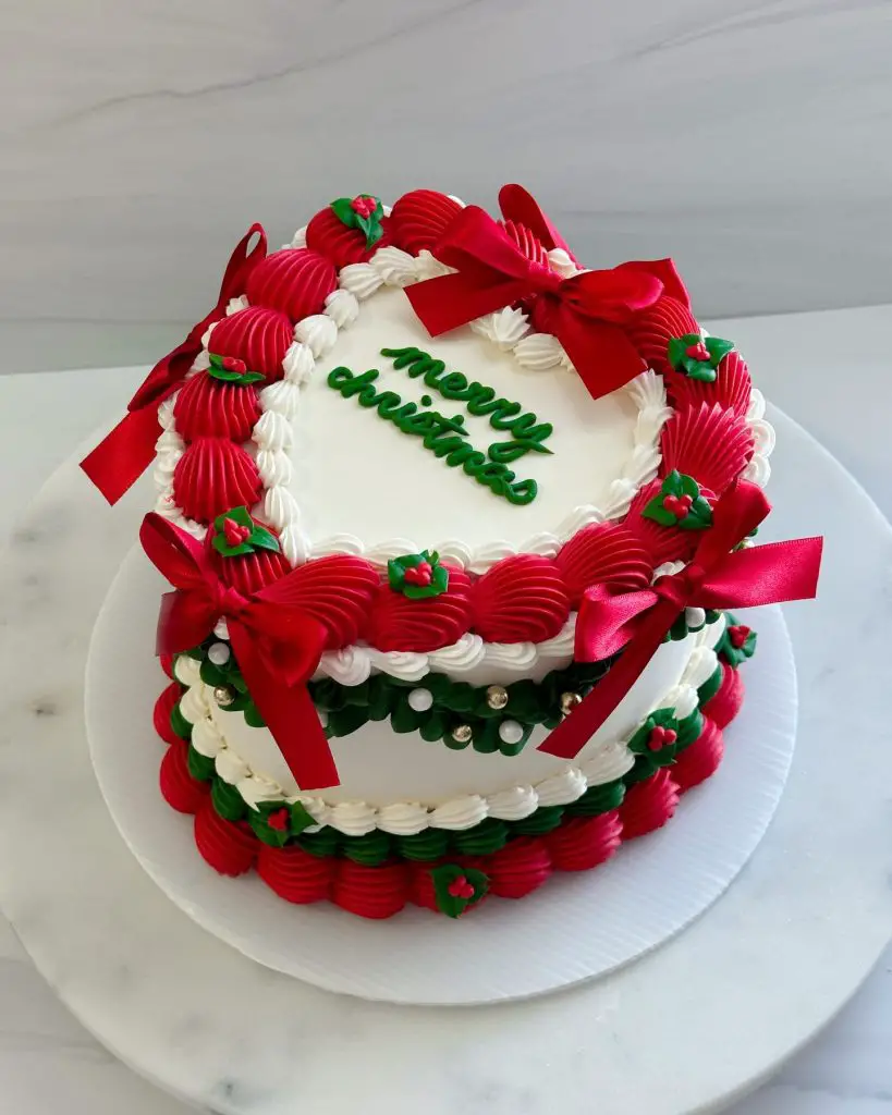 Seasonal elements are layered in without taking over. The bows, colors, and piping stay balanced, which keeps the heart shape dominant.