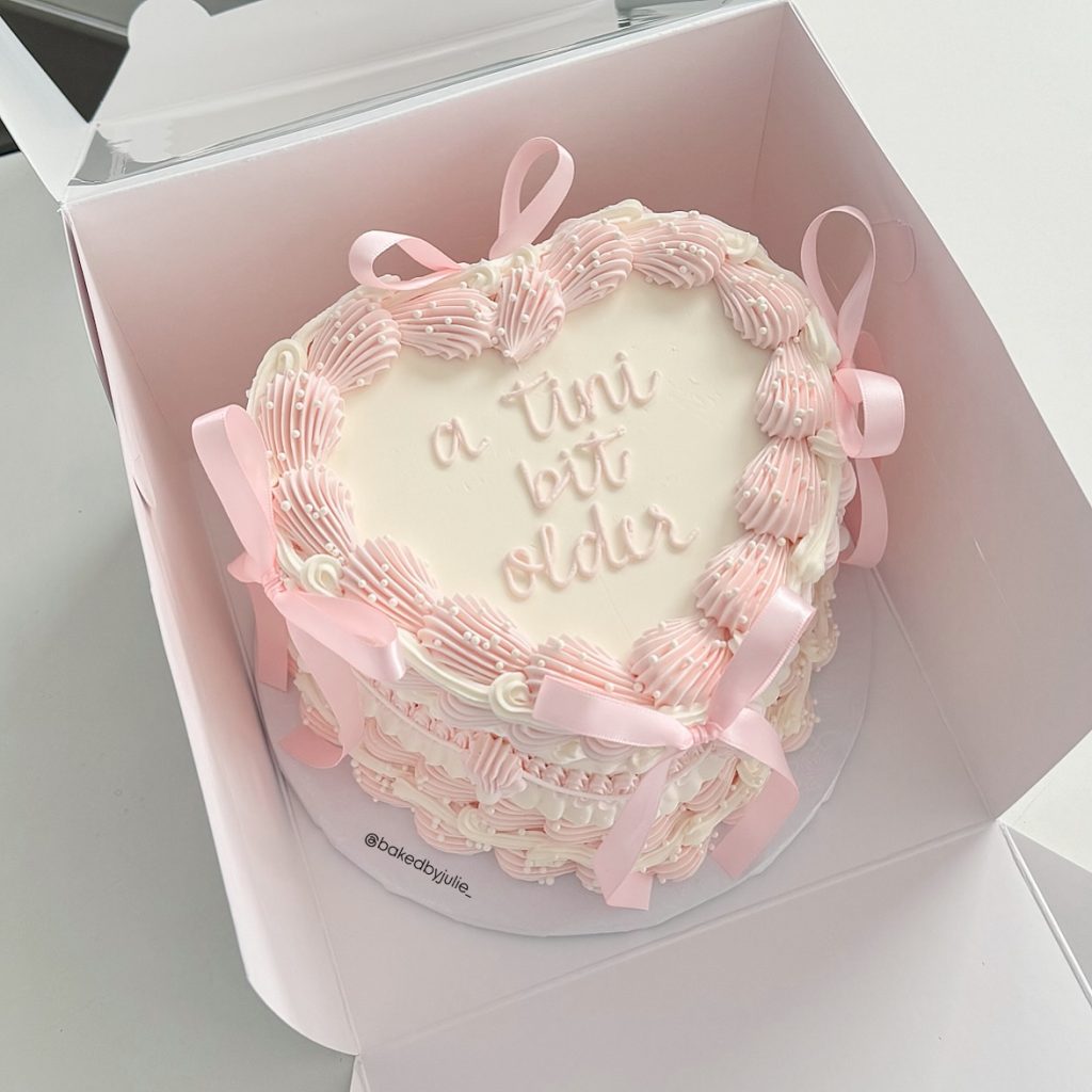 Presentation matters here. The box turns the cake into a gift instantly, while the soft piping keeps it warm and personal.