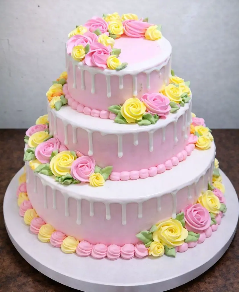 Three tiers are stacked with pink drip. Yellow and pink roses were placed on the edges for a classic look. It feels traditional and can feed a lot of people.