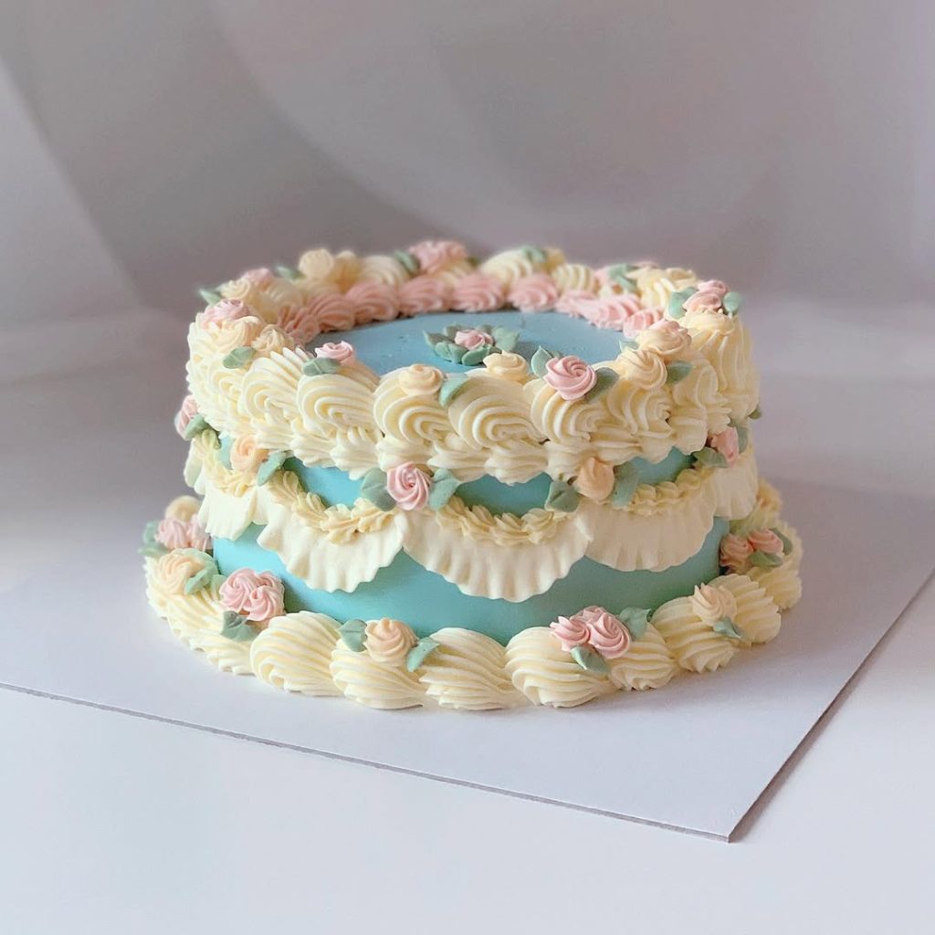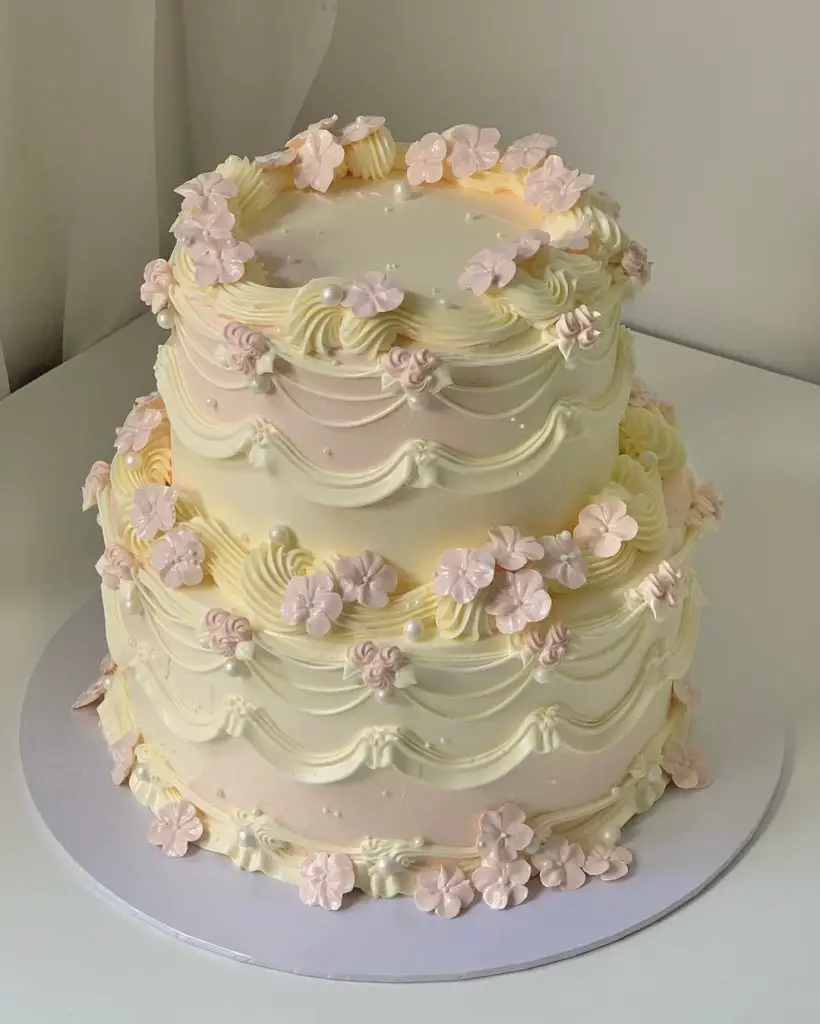Yellow frosting with ruffles looks like an old royal cake. Tiny pink flowers are tucked in the curves. It is a design that feels vintage but cool.