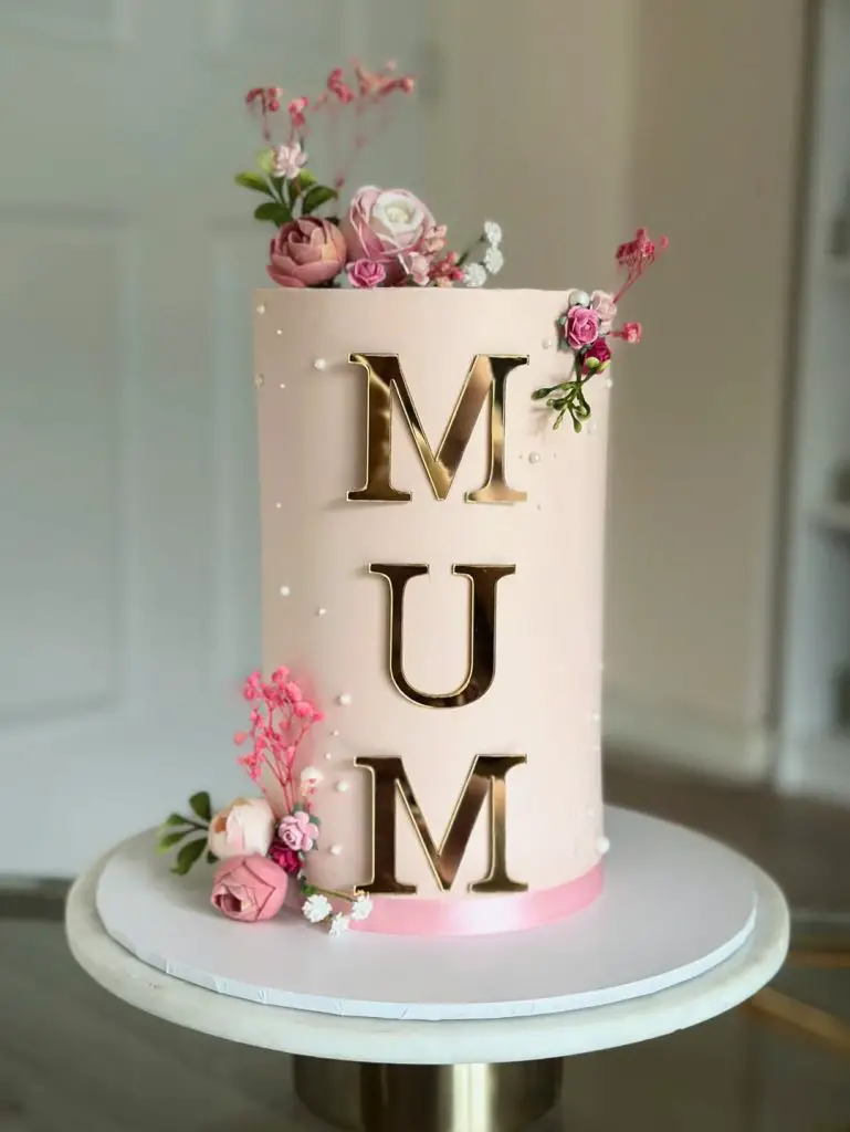 Gold letters on a tall cake always look expensive. The “MUM” stands out big time against the beige frosting and fresh flowers.