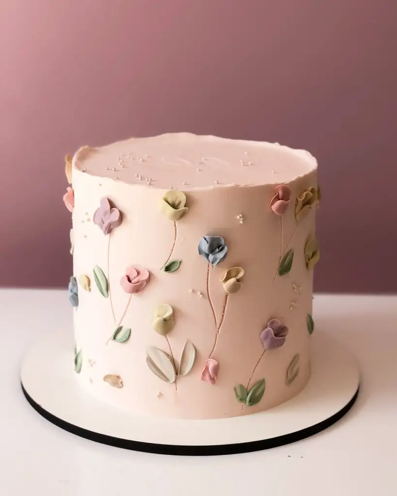 I think these bright colors are a total mood booster. A cheerful garden was piped onto this cake. It looks like a summer party in edible form. I love the mix of orange and purple. You can easily swap the colors to fit your specific theme.