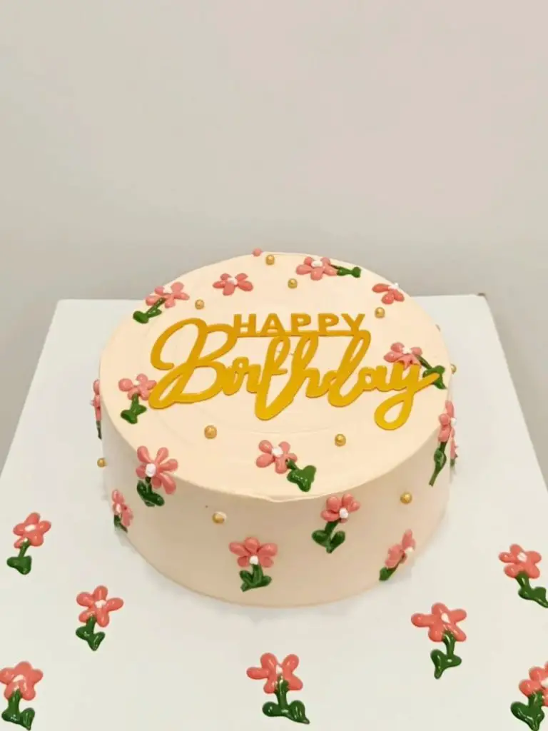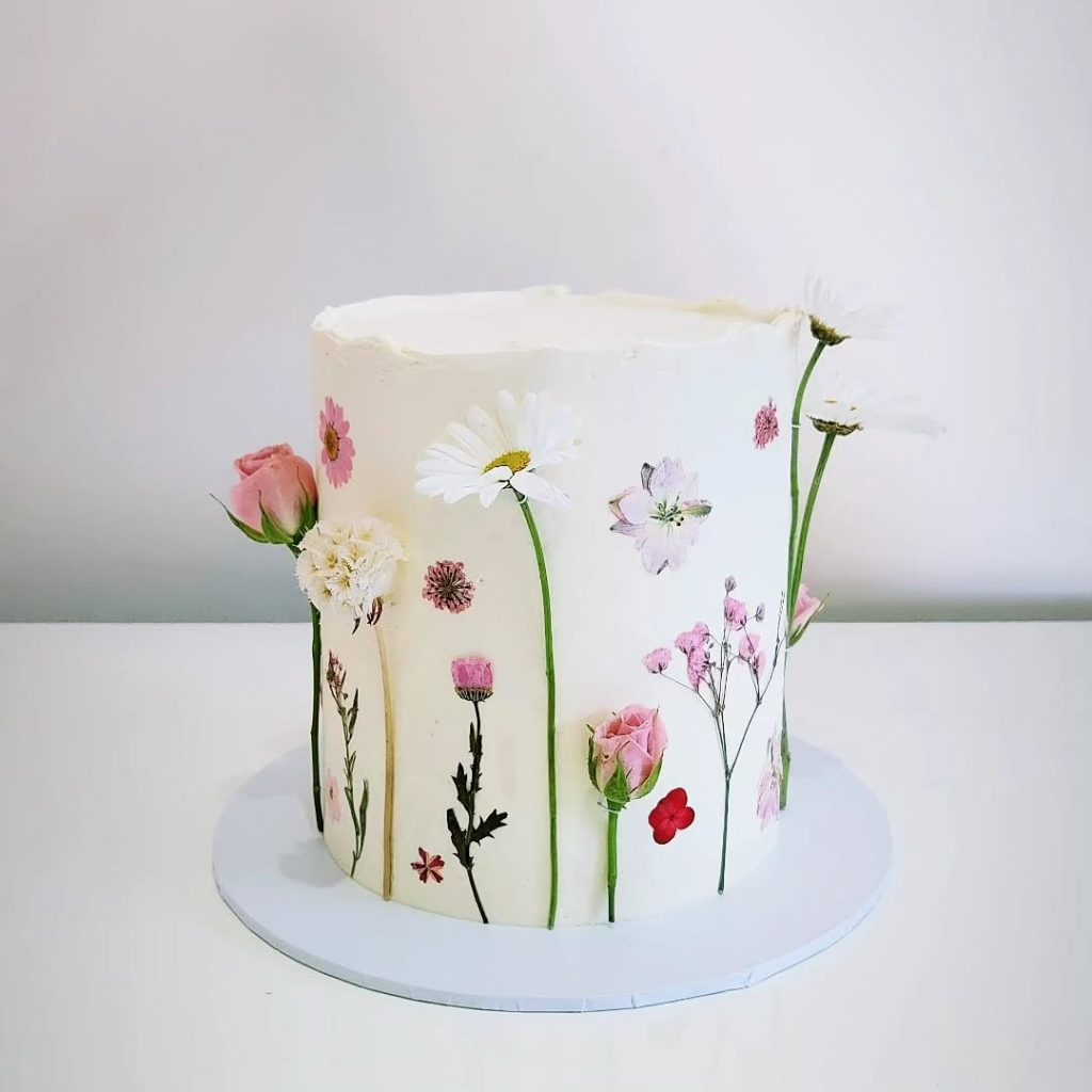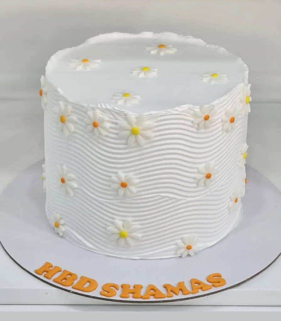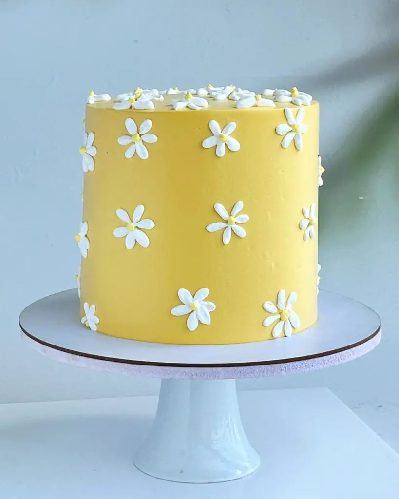 I love the energy of this bright yellow cake. White daisies were piped all over the surface. It is very bold. I think the yellow color makes the simple flowers look much more intentional. You should pick this design if you want to make a loud, happy statement.