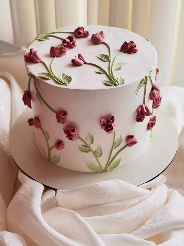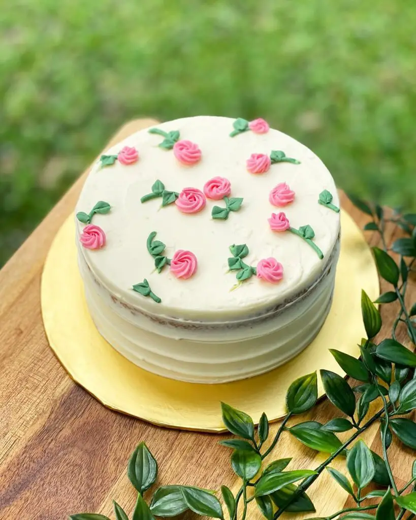 I love the symmetry of the green borders here. A traditional garden frame was piped by me. It feels very “high tea.” I think the small roses add just enough color to keep it from looking too plain. It is a timeless style that never goes out of fashion.