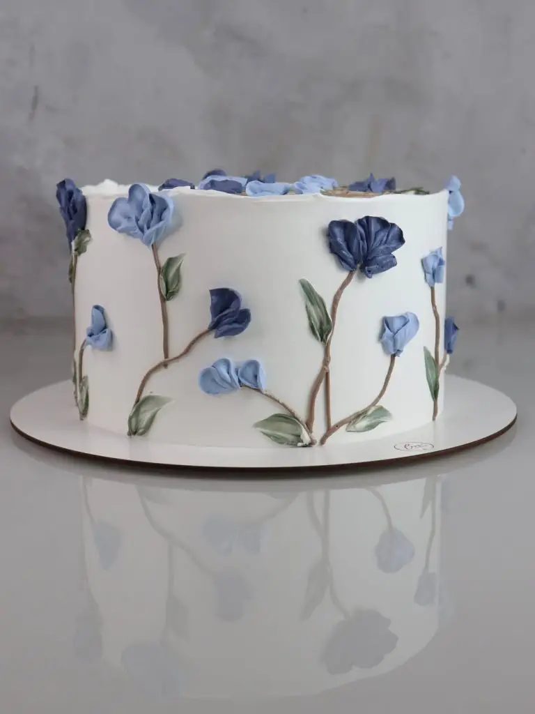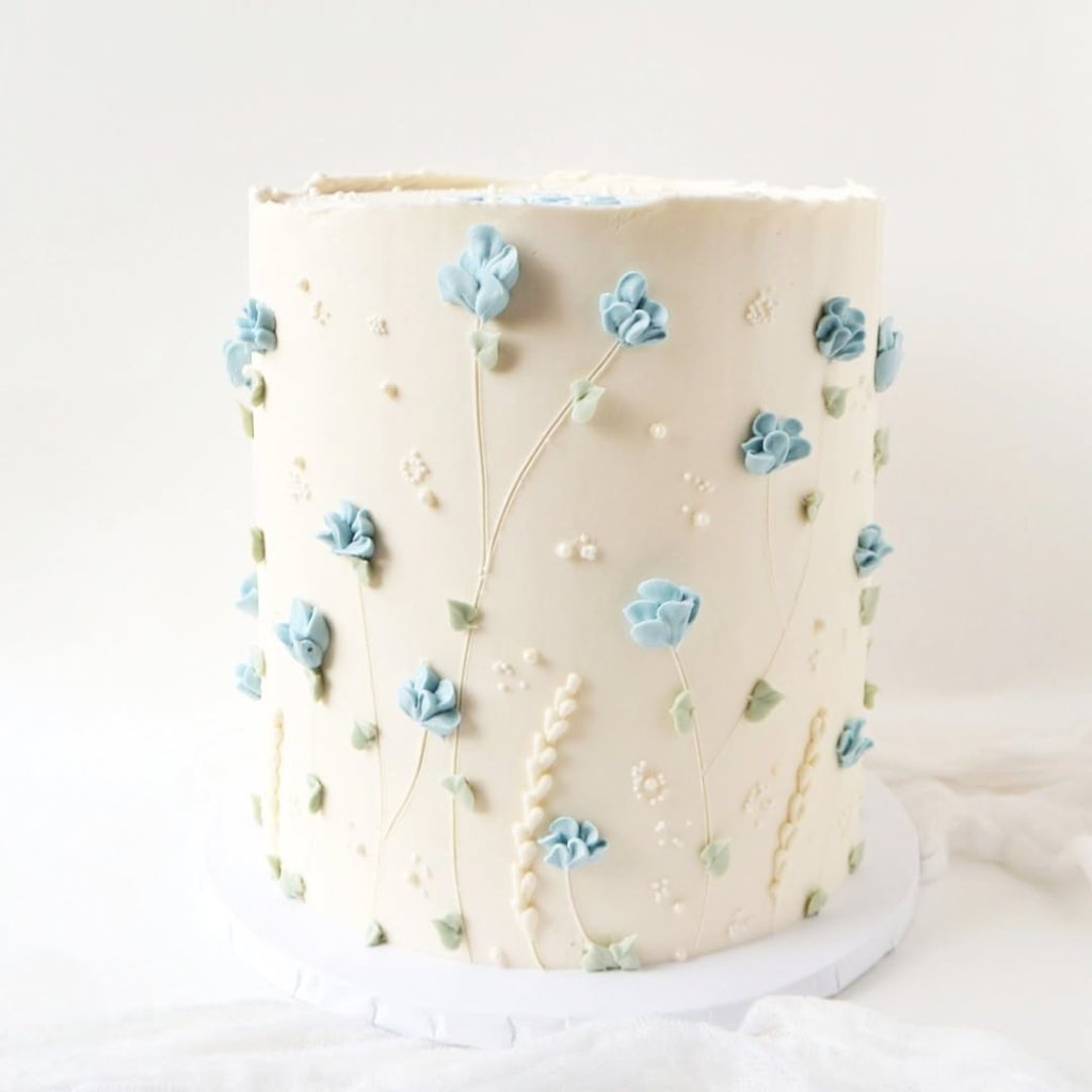 I think the textured “wavy” frosting on this base is a total aesthetic overhaul. The blue flowers were placed randomly to mimic a wild meadow. It feels very personal and handmade. Every guests will appreciate the effort you put into making something that looks so effortlessly beautiful and charming.
