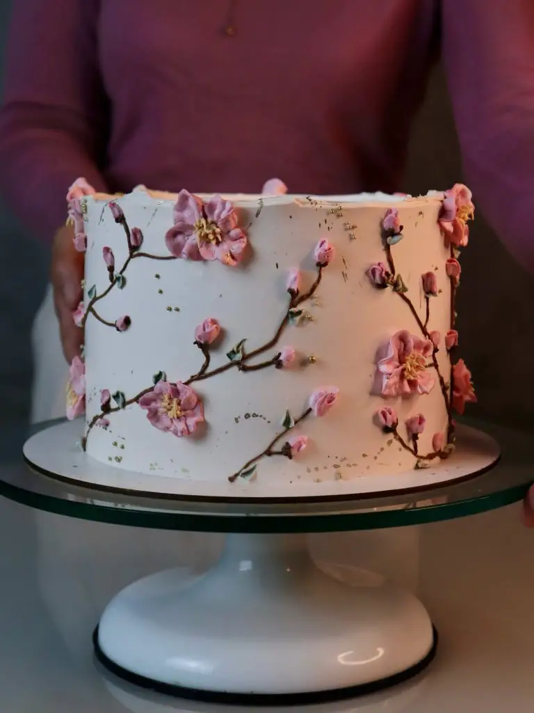 I am obsessed with how these branches move across the cake surface. The brown stems were piped by me in a sweeping motion. It makes the whole dessert feel alive and organic. This nature-inspired flourish is perfect if you want something that looks like it grew right out of the soil.