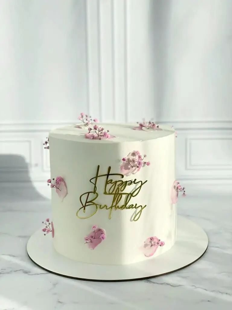 I am obsessed with the white space on this cake. The purple buds were placed intentionally to leave room for the script. It looks so expensive. I love how the modern acrylic topper pairs with the delicate botanical details. You will feel like a master decorator when you finish this one.