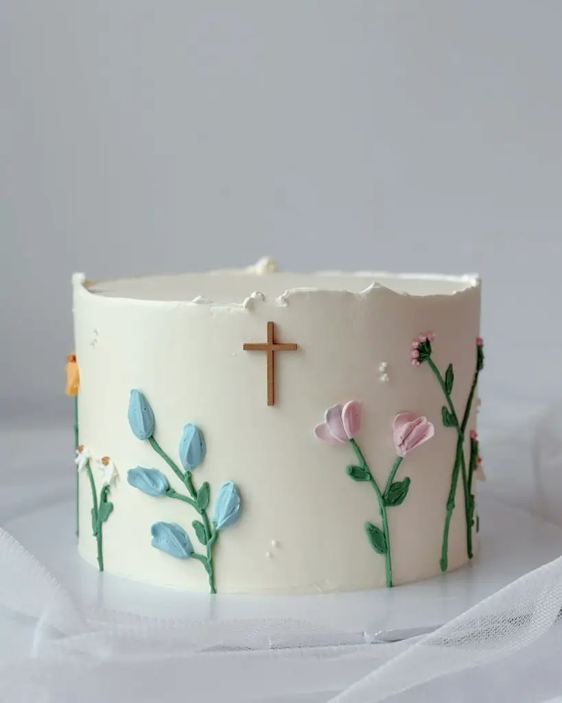 I love the peaceful energy of this design. The small flowers were arranged by me to frame the wooden cross. It is very respectful. I think the long stems give the cake a wonderful sense of vertical movement. You will find that this is the perfect centerpiece for a spring religious celebration or gathering.