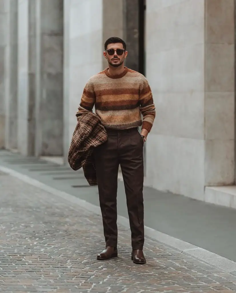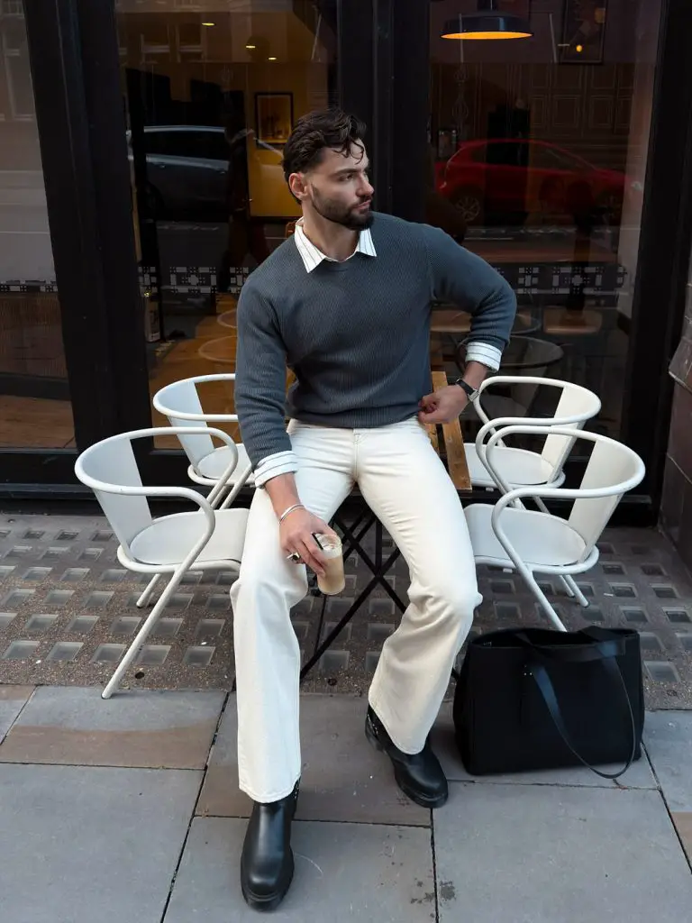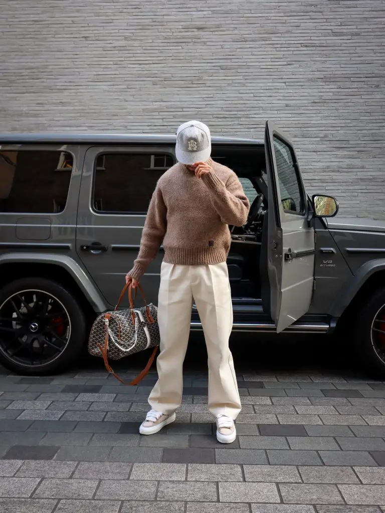 This outfit works because contrast is doing the work quietly. The knit feels relaxed, the trousers stay controlled, and together they meet in the middle. It looks intentional, even when worn on autopilot. Some structure was added, some comfort left untouched.