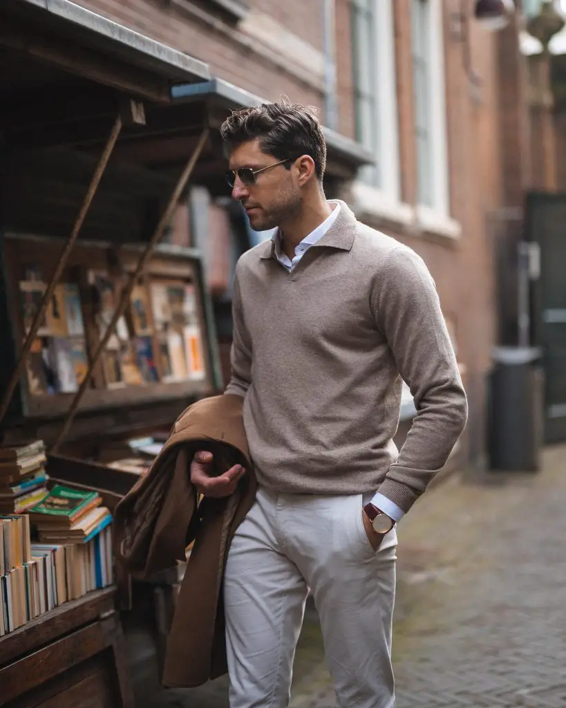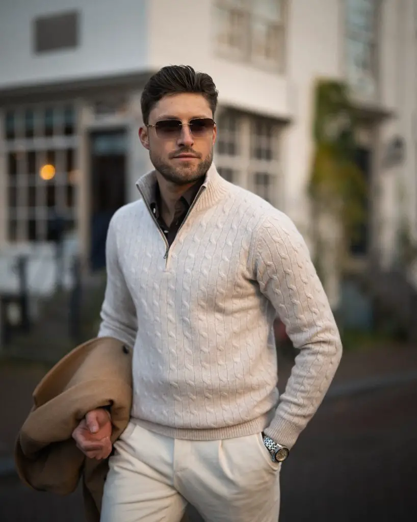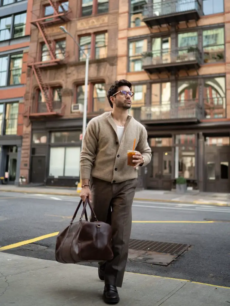Texture takes over here. The sweater holds attention while everything else stays calm. The coat being carried instead of worn adds an offhand feel that makes it human.