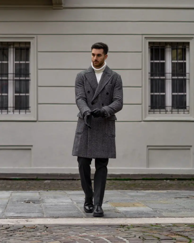 There’s discipline in this outfit. The coat leads, the rest follows. Gloves, footwear, posture — all of it works together, even if worn half-aware on a cold morning.